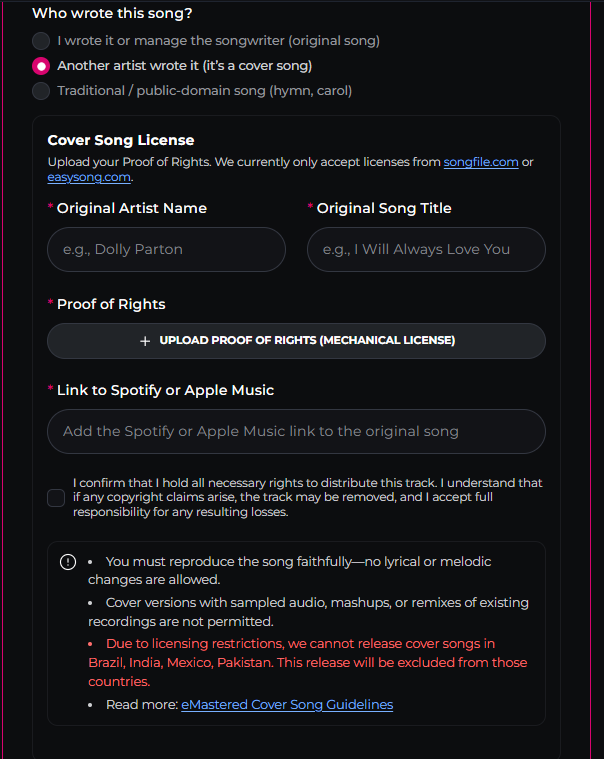 Please note: eMastered no longer obtains cover song licenses on your behalf. If you want to release a cover song, you are responsible for securing the proper license before uploading your track.