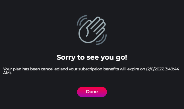 When completed successfully you ill see a confirmation page that advises of the date your access to the service will end: